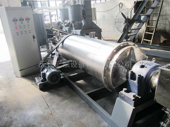 本機為臥式筒形旋轉(zhuǎn)裝置,外沿齒輪、鏈輪或皮帶傳動,兩倉格子型球磨機。物料由送料機進入料中空軸螺旋均勻地進入球磨機倉,內(nèi)裝三種不同規(guī)格的球介,筒體轉(zhuǎn)動產(chǎn)生離心力將球介帶到一定高度后落下,對物料產(chǎn)生重擊和研磨作用。物料在倉達到粗磨后,經(jīng)單層隔倉板進入第二倉,該倉內(nèi)裝有四種不同規(guī)格的球介,將物料進一步研磨。粉狀物通過出料口篩欄板排出,進入振動篩粉機進行分級完成粉磨作業(yè)。